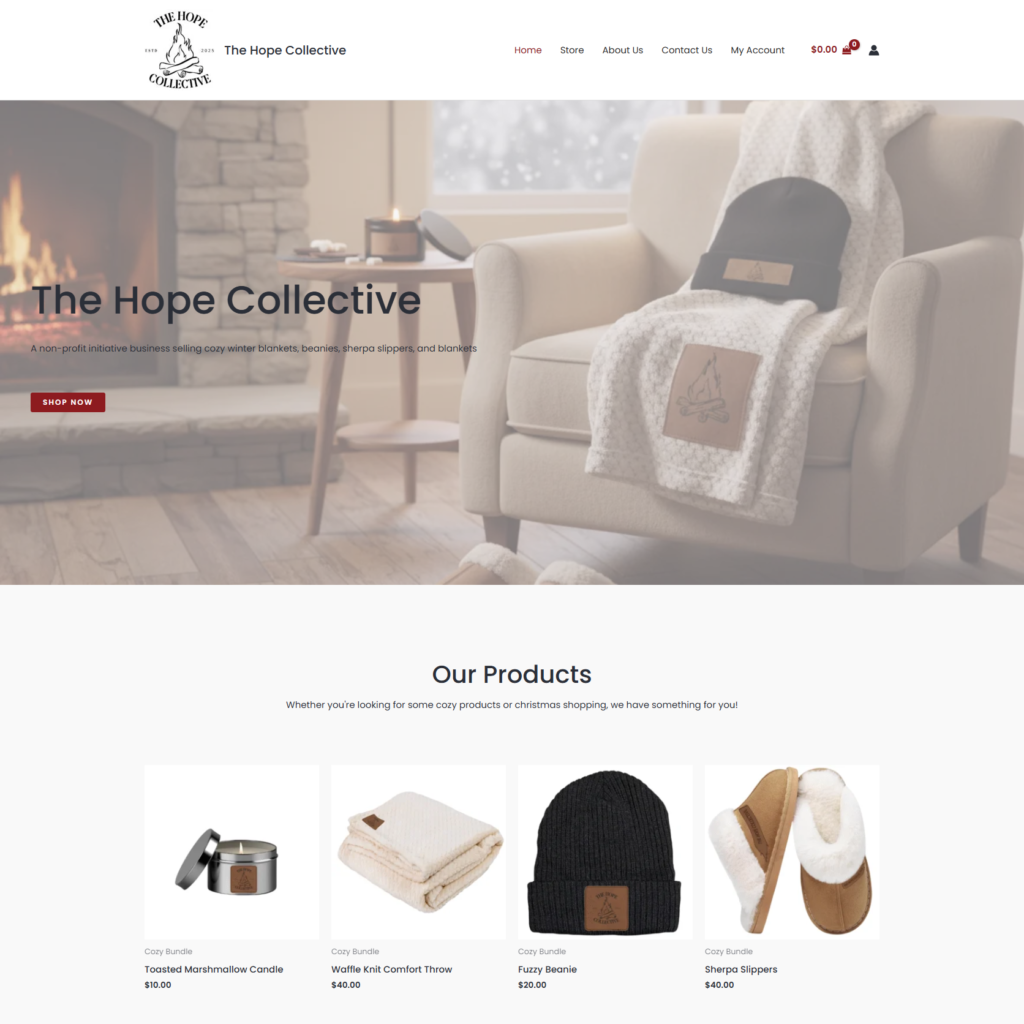 An e-commerce website for a non-profit initiative selling cozy winter gear to donate the profits to cancer patients.